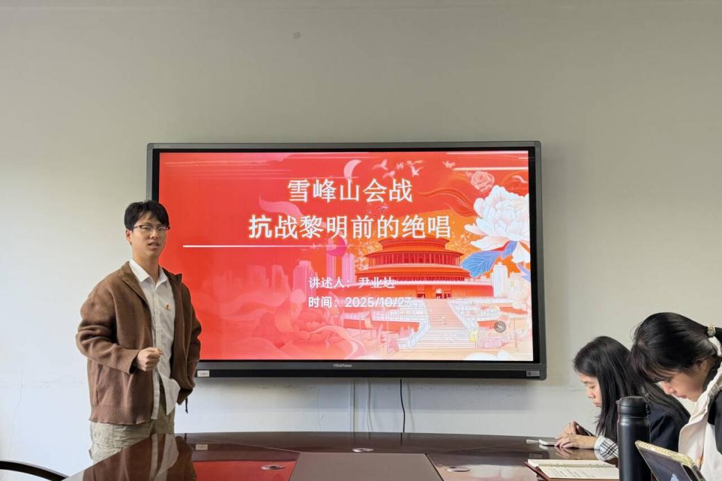 尹业达同志给大家分享的是家乡湘西会战的故事。湘西会战中,中国军民以血肉之躯抵御日寇,每一寸土地都浸染着烈士的鲜血,历时两个多月,以中国军队的全面胜利告终。此役之后,日军在中国战场再无发动大规模进攻的能力,而中国军队则乘胜追击,逐步收复失地,为全面反攻创造了有利条件。这也让我们意识到,作为新时代青年,我们要以革命先烈为榜样,坚定信念,勇于担当,团结协作,传承精神,在新时代的征程中砥砺前行,为实现中华民族伟大复兴的中国梦贡献自己的力量。