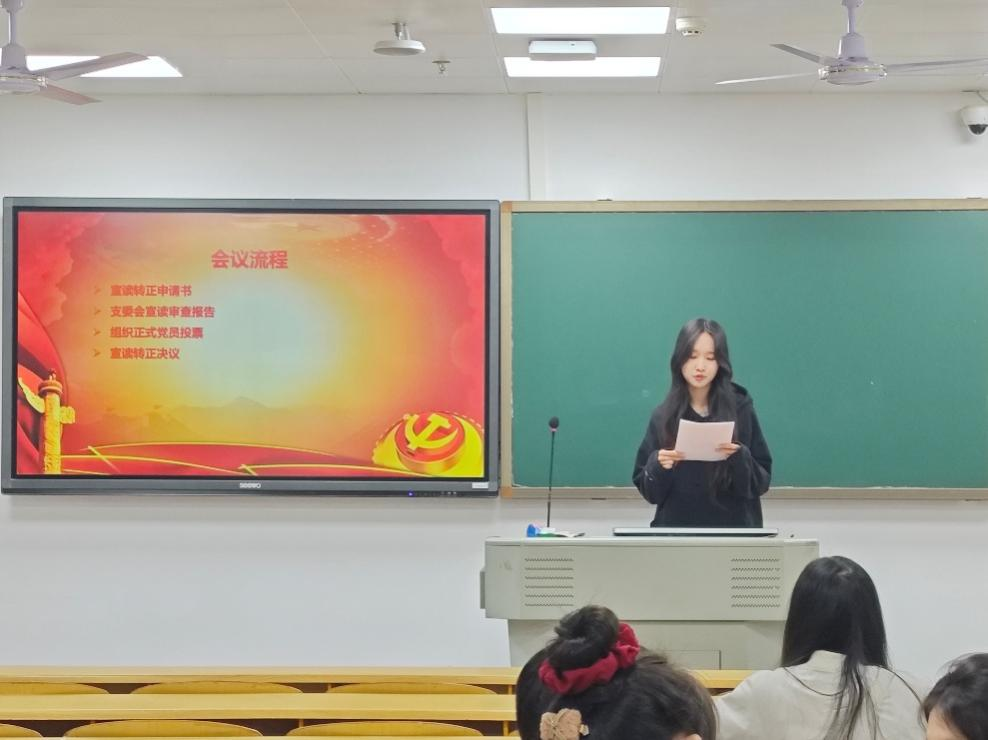 会议第二项议程为讨论预备党员接收事宜。首先,黄琳、汪琳两位同志逐一上台宣读入党志愿书,向大会汇报个人对党的认识、入党动机等情况。随后,两位发展对象的入党介绍人分别介绍了她们在作为入党积极分子期间的考察情况,一致认为两位同志入党动机端正,积极向党组织靠拢,具备成为预备党员的条件。接着,支委会宣读对发展对象的审查报告。经支部委员会审查,黄琳、汪琳两位同志能够自觉拥护党的纲领、遵守党的章程,政治历史清楚,直系亲属及主要社会关系拥护党的领导,党内外群众评价良好,符合党员发展条件。与会正式党员进行充分讨论后,大会以无记名投票的方式进行表决,根据投票结果与支部大会讨论决定,同意接收黄琳、汪琳两位同志为中共预备党员。
