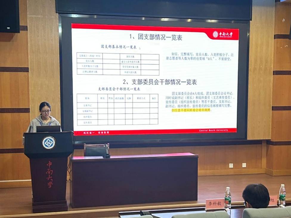 会议伊始,团委组织部谢雨昕同学聚焦团支部工作手册填写规范,从手册记录要点、活动设计逻辑等方面进行细致讲解,并且就主题团日活动开展培训,旨在推动团日活动开展规范化、特色化。