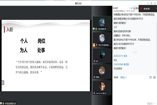 随后,主讲人彭洋就职业的选择、选调过程与经历及工作现状等方面进行了分享。他指出“正确决策是基础,有效方法是途径,天道酬勤是关键”,对于职业应该慎重选择、三思而后行,有志向和需求的同学要早规划、早接触、多交流、多储备。在备考过程中要有序复习,保持平和心态,踏实走好每一步。