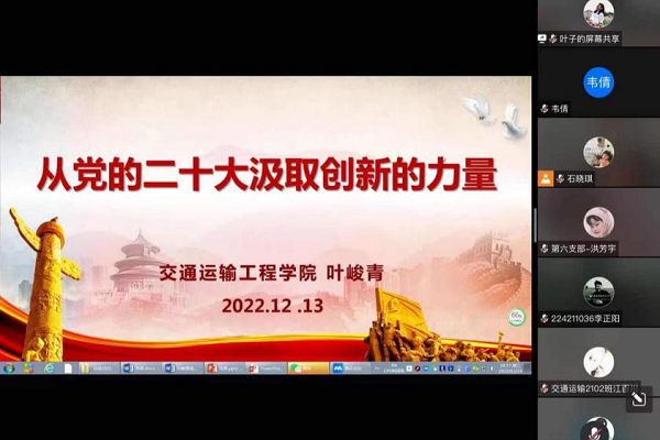 随后,叶峻青老师于线上为两个支部全体党员讲授《从党的二十大汲取创新的力量》主题党课。叶老师主要从“党的二十大报告的重大理论创新”“详解二十大报告中点赞的创新领域”“立足平凡勇于创新”三个方面作党课分享。期间,叶老师围绕党的二十大提出的一系列新观点、新论断、新思想、新战略、新要求进行逐一讲解,并就海铁联运、集装箱中心站等案例与交通学子们共同探讨交通创新之道。