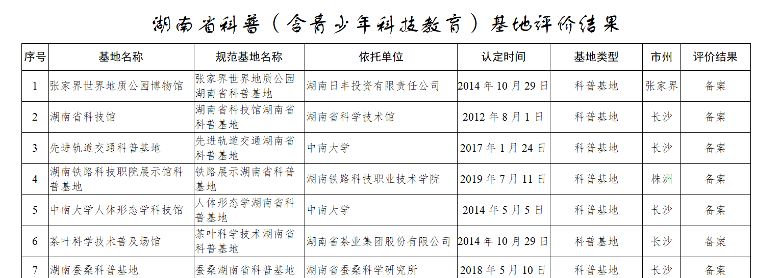 根据《湖南省省级科学技术普及基地管理办法》(湘科发〔2021〕143号)、《关于开展湖南省科普(含青少年科技教育)基地绩效评价工作的通知》 经依托单位自评、市州审核、专家评审、会议审定、公示等程序,现将2022年湖南省科普(含青少年科技教育)基地绩效评价结果予以公布
