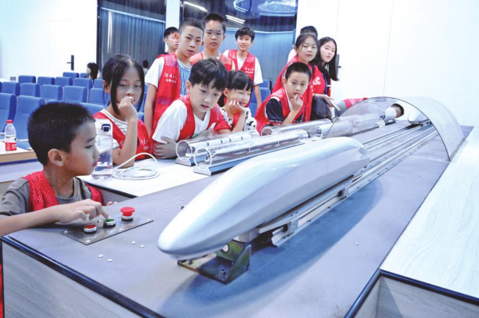 大学生讲解员胡钰瑶早早地就在科普馆内等候,期待着与《放学后》的小读者和湖南日报全媒小记者一同探索火车变形的奥秘。在结束了校园、高速列车研究中心列车气动特性和轨道车辆碰撞实验室参观后,同学们的小本子上密密麻麻地记录着他们的疑惑与好奇。一见到胡钰瑶老师,他们便迫不及待地抛出了心中的问题:“高铁车头为什么像‘子弹头’?”“高铁的窗户为什么不能打开?”“高铁的轨道和普通火车的轨道有何不同?”面对小朋友们的热切提问与思索,胡钰瑶老师笑了笑,竖起了大拇指,随即为大家播放了一段视频。